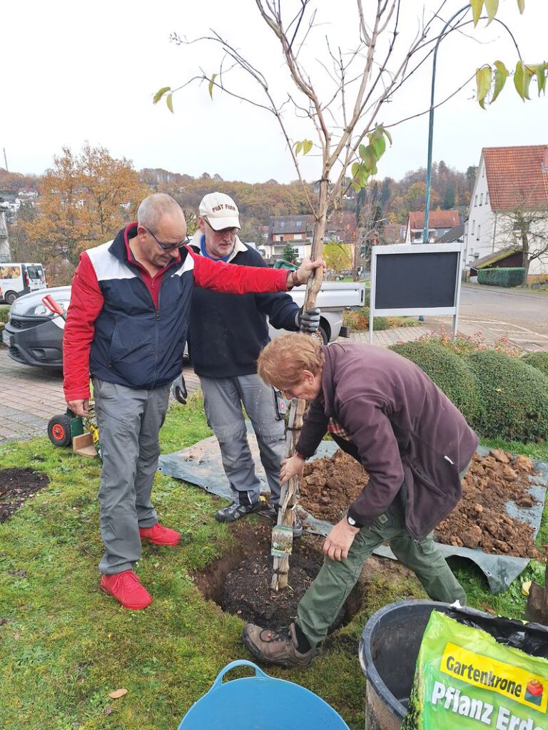 Am 14. November 2025 trafen sich die Kirchenvorstandsmitglieder Kerstin Gruel-Dorn, Sabine Janssen, Reiner André und Torsten Kurpiers sowie die neu gewählten Mitglieder Heinz-Jürgen Balzer und Roger Schöpf um unter fachkundiger Leitung von Kerstin Gruel-Dorn einen Heptacodium miconioides zu pflanzen. Dieser auch Sieben-Söhne-des-Himmels-Strauch genannte Baum soll uns an unsere am 26. April 2025 verstorbene Pfarrerin Annette Reidt erinnern.
