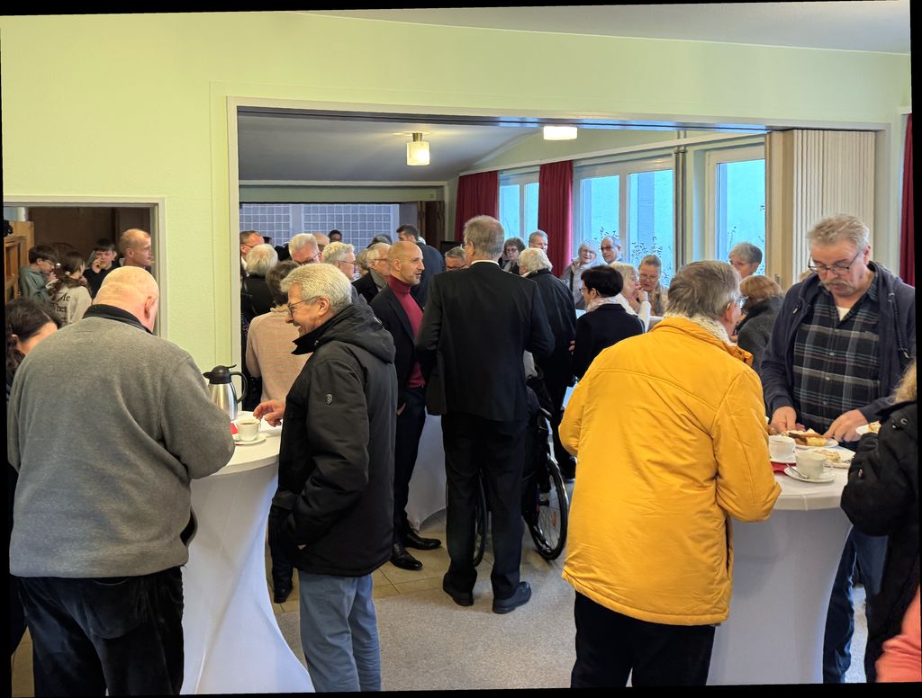 Mit den Worten „Ihr seid Alle eingeladen“, stimmte KV-Mitglied und Küster Roger Schöpf die Gottesdienstteilnehmer am Ende des Gottesdienstes auf den inoffiziellen Teil ein. Bei Kaffee, Kuchen, Softgetränken und Sekt folgte ein lebendiger Austausch der zahlreich verbliebenen Gottesdienstbesucher.